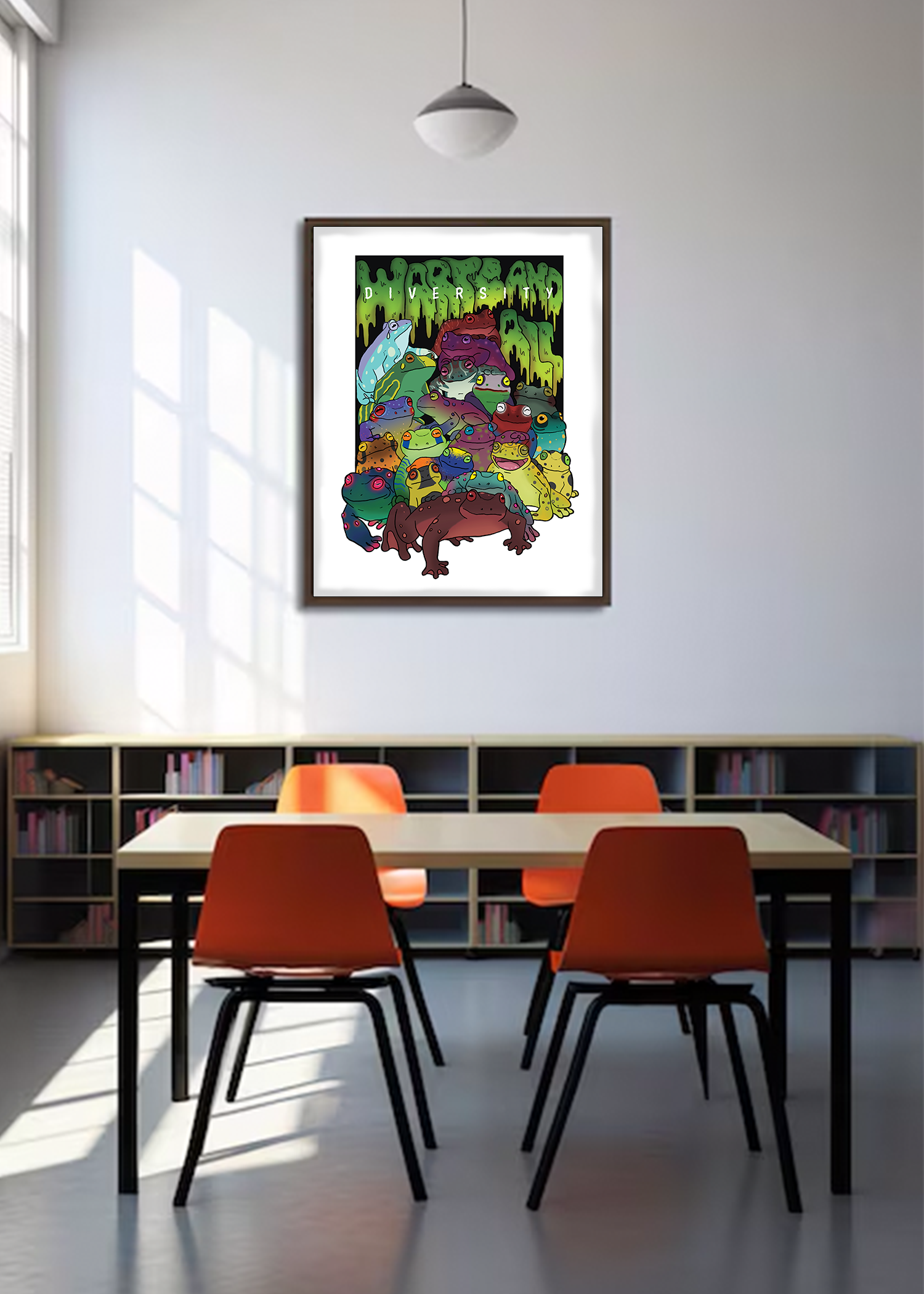 "Warts and All" is a vibrant diversity poster featuring a playful group of funky frogs, each embracing their unique quirks and imperfections. The poster celebrates individuality, reminding us that true beauty lies in our differences. Through the fun and colorful depiction of these frogs, we highlight the importance of accepting and celebrating diversity in all its forms. Warts and all, every frog is special!